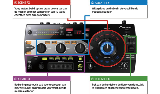 Vrije controle over de sound via intuïtieve bediening van de verschillende Scene FX, Isolate FX, X-Pad FX en Release FX