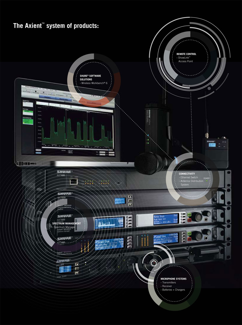 Het Axient draadloze microfoon netwerk systeem van Shure is een nieuwe mijlpaal op gebied van controle, gebruiksgemak en betrouwbaarheid in draadloze audio transmissie, omtvangst en spectrum management voor high-end toepassingen.