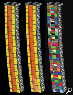 links wordt de array gewoon drieweg aangestuurd, in het midden wordt de array gedeeltelijk apart aangestuurd en uiterst rechts zie je de MLA met in dit voorbeeld 144 apart aangestuurde cellen.