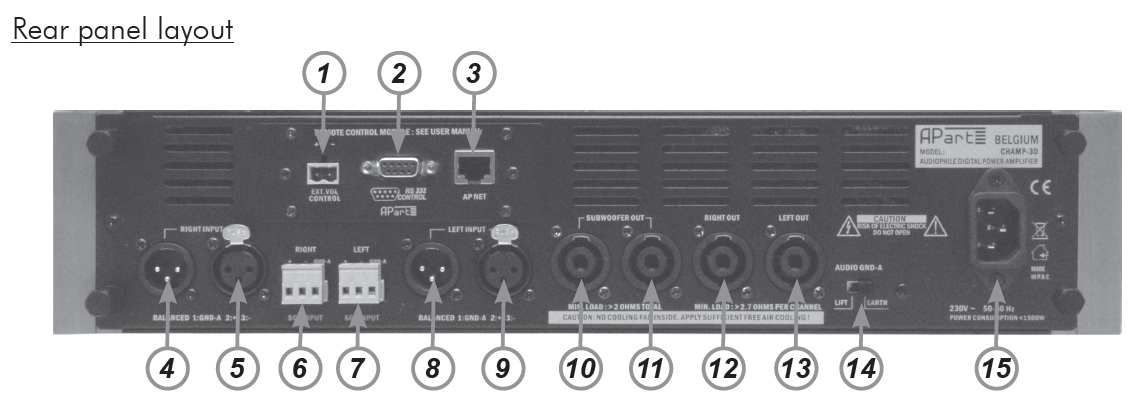 15) Mains inlet connector: plug in the supplied mains cable here. The mains fuse is located
